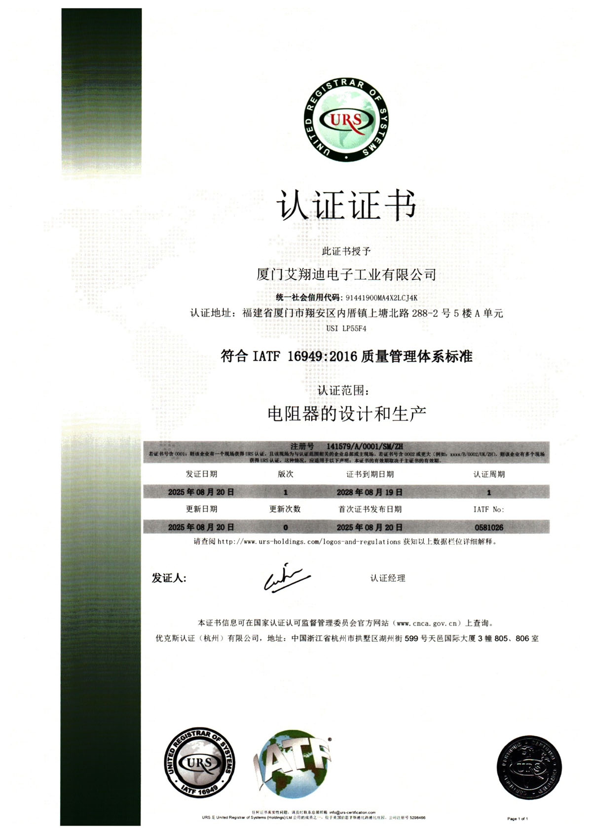 厦门艾翔迪电子工业有限公司于2025年8月20日获得IATF16949:2016质量管理体系标准认证证书
